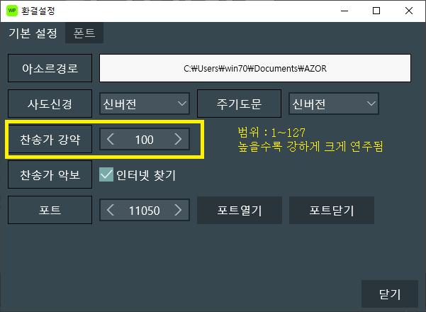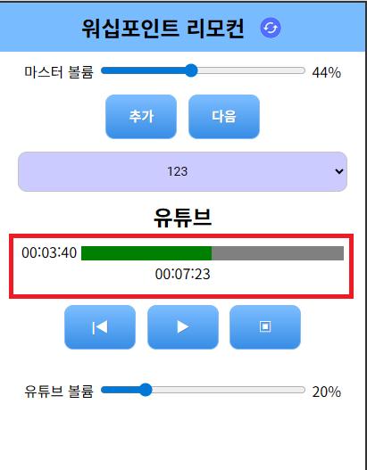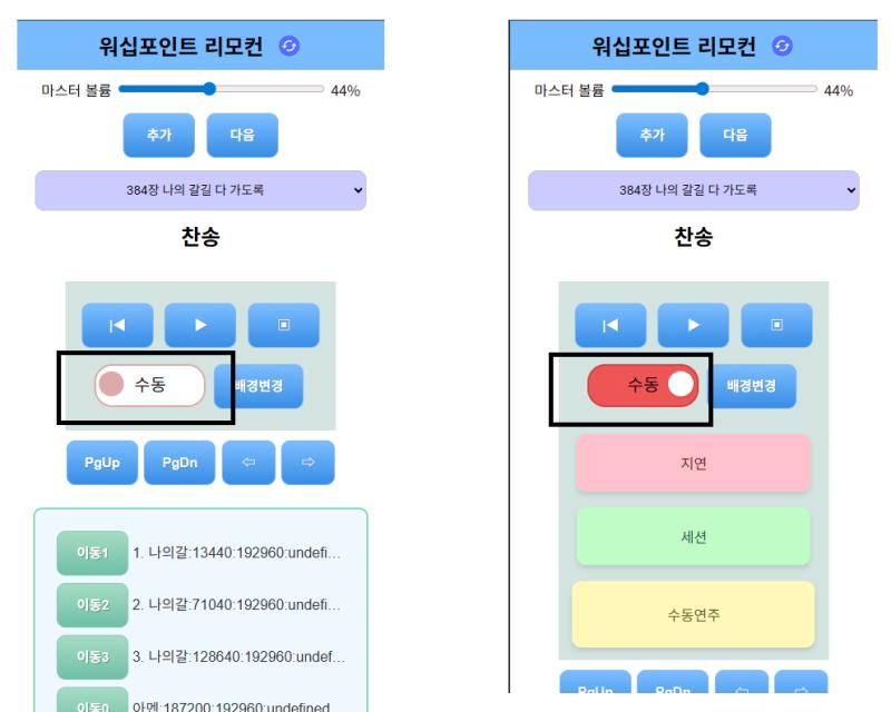 유튜브 주소에 목록이 포함된 주소가 안되는 오류 수정 https://youtu.be/YnyY7dsWPg0?list=PLKVJw0ftlL1VmiLmUp1UmOrHfsgpEcScT == 리모컨 업그레이드 == * 리모컨에 배경변경기능 넣기 - (가사, 찬송,찬양) ![]() * 찬송가 수동 반주 숨기기 처리 수동반주를 보였다 감추었다 옵션으로 바뀌었습니다 ![]() * 유튜브 플레이시 프로세스바 표시 안되는 오류 수정 ![]() * 아래는 찬송가 찬송가 수정 내용 입니다 강약 기본 값을 설정할 수 있게 했습니다 ![]() 빠르기 수정한 곡 목록 89장 293장, 298장, 300장, 309장, 315장, 357장, 384장, 412장, 430장, 621 늘임표 수정한 곡 384장 늘임표 2 > 5 (2.5배로 수정) | |||||