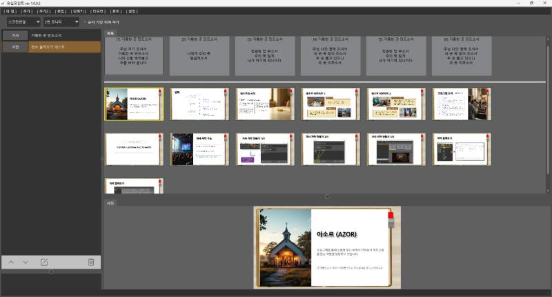 ![]() 무료 폰트 설치 기능 네이버 무료폰트를 손쉽게 설치하는 기능이 추가 되었습니다 ![]() 모니터 숨기기 / 보이기 모니터를 단축키 F7로 숨기거나 보이게 할 수있습니다 ![]() 순서지 추가 위치 변경 목록에 순서를 추가 할 때 위치가 변경되었습니다. 순서지 추가를 할 경우 기본은 현재 위치 바로 아래에 추가됩니다. 만약 순서 가장 뒤에 추가에 체크가 되어 있으면 항상 가장 뒤에 추가 됩니다 ![]() == 그 외 수정 사항 == 휴지통에 temp 폴더가 쌓이는 것을 없앴습니다. 음악, 영상 볼륨 초기값이 50 > 15 로 (작게) 변경되었습니다 불러오기 할 때 이전 폴더를 기억해서 계속해서 같은 폴더 읽기가 용이해졌습니다. == 찬송가 데이타 수정 == 452 중간 늘임표 없애기 516 빠르기 96> 102 539 빠르기 57> 60 204 빠르기 86 > 93 405 빠르기 105 > 108 546 빠르기 105 > 108 늘임표 5 382 빠르기 60>63 442 마지막 늘임표 없애기 85장 마지막 늘임표로 억지로 넣기 430장 빠르기 99>108 540장 빠르기 96>102 488 중간 늘임표 없애기 492장 늘임표 2배 | |||||